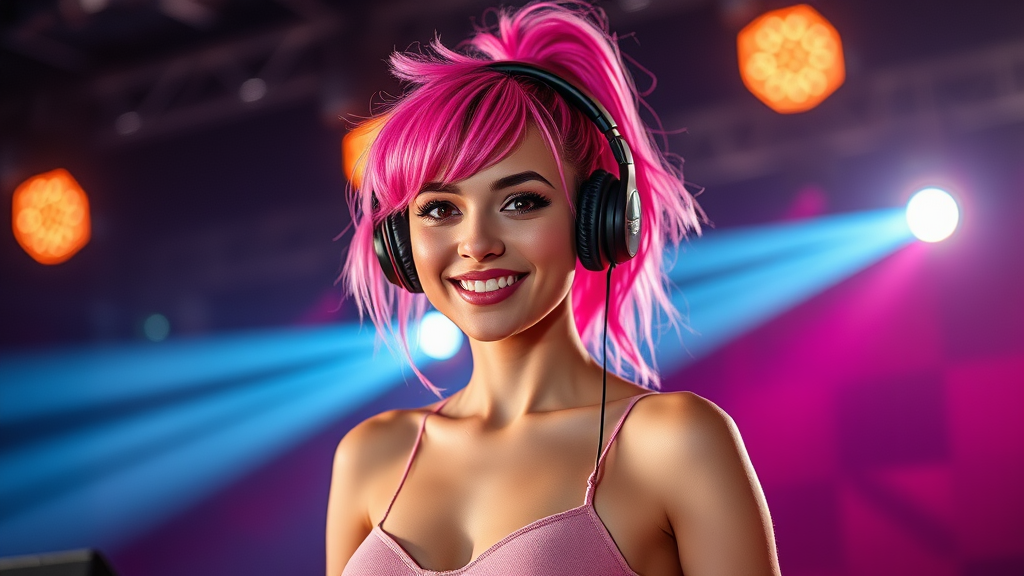 24-year-old female DJ with bright pink hair styled in a messy ponytail, wearing detailed headphones and giving a medium smile. She's standing confidently on a stage with an 8k resolution, capturing extremely clear realism and cinematic lighting. The image boasts high resolution with professional color grading and a touch of film grain for authenticity. Her slender figure is highlighted in the scene, exuding energy and passion for music, surrounded by an intense atmosphere that emphasizes her captivating presence without any distortion in anatomy.