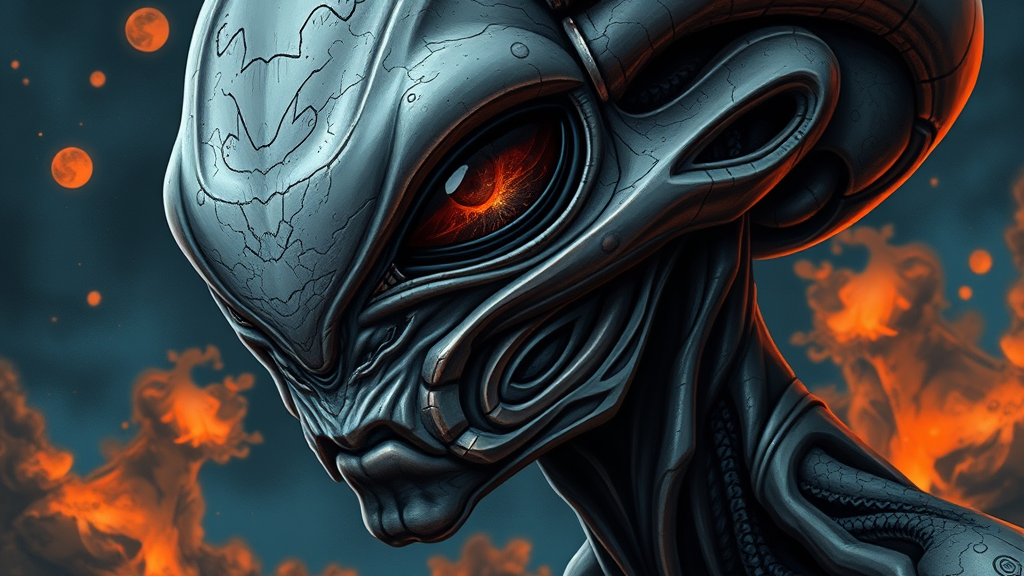 2D art of an alien, featuring textured illustration style with dark gray and bronze tones, inspired by Naoto Hattori and Jeremy Lipking, incorporating elements reminiscent of online sculptures. The background is a dark sky-blue with vibrant orange accents, showcasing intense close-ups of the alien's intricate features, emphasizing a surreal and otherworldly aesthetic.