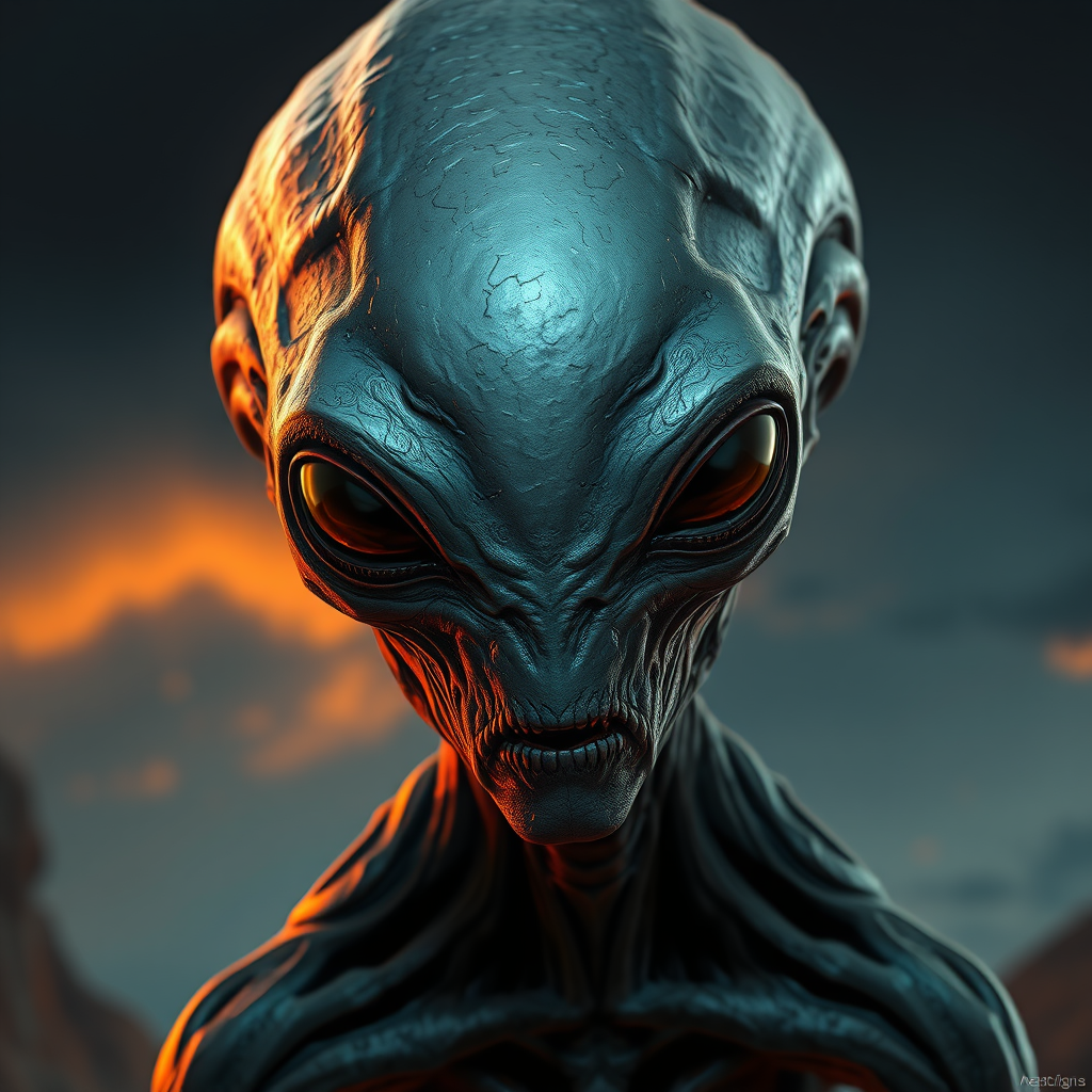 2D artwork of an alien inspired by textured illustrations, featuring a dark gray and bronze color palette, reminiscent of digital sculptures in the style of Naoto Hattori and Jeremy Lipking. The scene captures the essence of a dark sky-blue and orange setting with intense close-ups and a focus on intricate details. The composition embraces elongated proportions and utilizes high stylization for a captivating visual experience.