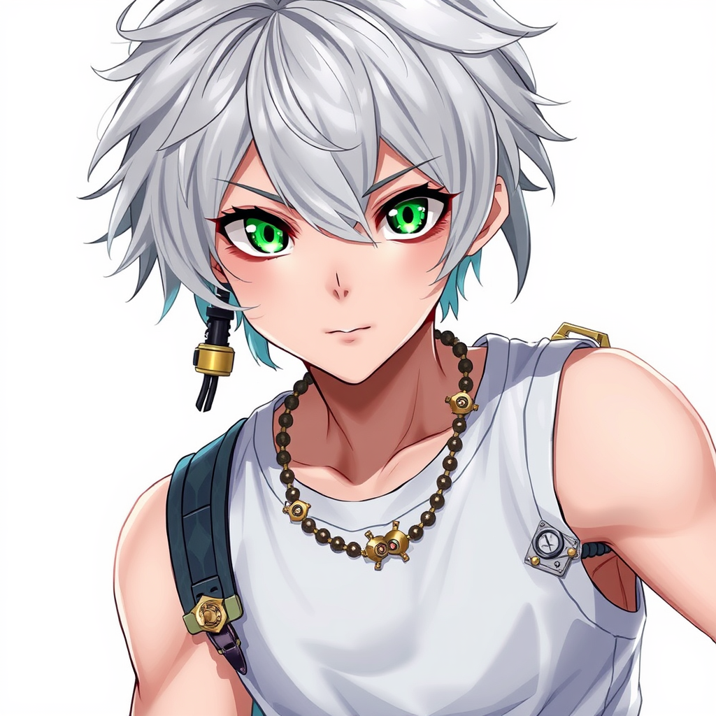 2D game art depicting a young man with silvery gray hair, aged 16, featuring vibrant green eyes. He wears a stylish white tank top paired with intricate steampunk-inspired accessories. The character is illustrated in a dynamic anime style, capturing motion and energy, with ultra-detailed features. The background is pristine white, elevating the figure's design. The artwork is in high definition, inspired by the artistic elements seen in Granblue Fantasy, with creative influences from artists such as Hideo Minaba, Yuya Nagai, Ryoji Ohara, Ryota Murayama, and Hitomi Yoshimura. The overall portrait maintains a 9:16 aspect ratio, capturing a blend of elegance and vibrant creativity, embodying the essence of anime and game art.