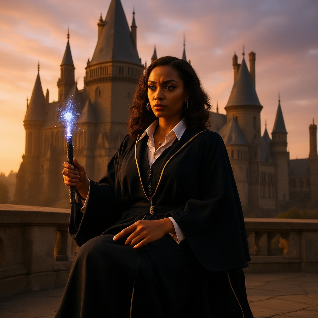 A determined 30-year-old African American woman stands confidently in front of the majestic Hogwarts School of Witchcraft and Wizardry, practicing the Dark Arts with skillful precision. Clad in a sleek black and gold Hogwarts robe, her wand hand is alight with magical energy as she directs her focus toward honing her spellcraft. Her expression is fierce and focused, revealing her dedication to mastering these arts to protect her students from an imminent threat. The scene, shot at golden hour, bathes the castle and the woman in a warm glow, enhancing the enchanting ambiance with subtle hues of blue and purple. Her wand movements are elegant and disciplined, showcasing years of dedication. The iconic Hogwarts castle looms with grandeur in the background, a testament to the storied history and tradition of the wizarding world. This cinematic scene, directed with the visionary touch of Ryan Coogler, captures the intensity and passion with which the woman embraces her magical journey.