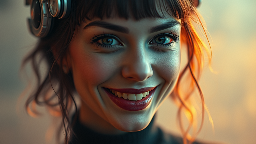 30-year-old rawboned woman with a cheeky smile, inspired by artists Mark Citret, Guillermo Espinosa, Carl Frederik von Breda, Ed Benedict, Sebastian Errazuriz, and Colin Campbell Cooper. Steampunk aesthetic, utilizing negative space and color grading to create a cinematic film still. Captured in an analog style, this hyper-realistic portrait features an 8k UHD resolution with DSLR quality, showcasing soft lighting and film grain. Photographed using a Fujifilm XT3 and Olympus XA2 Camera, with a 50mm lens at F/2.8, incorporating HDR effects and volumetric lighting amidst a dreamy fog. The image highlights reflections with a shallow depth of field, portrayed in absurd detail as a fashion shot with a psychedelic twist and a Thomson MO5 color palette. Modular constructivist elements contribute to the editorial cover art feel, ensuring realistic and pretty features. The cinematic composition ensures high quality, while avoiding cartoonish elements and maintaining clarity in every detail.