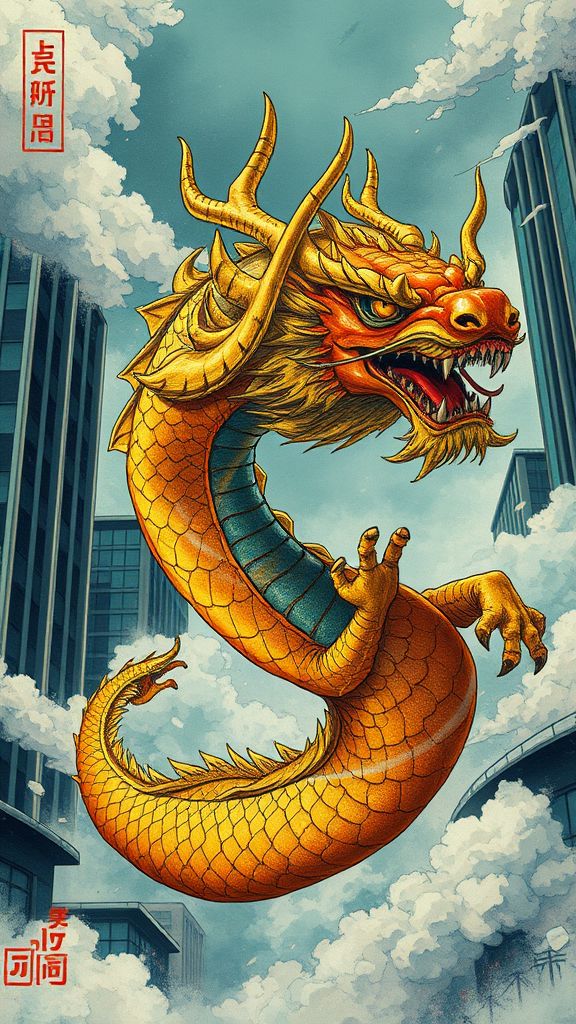 3/4 view Chinese style dragon with inkpunk influence, featuring a metallic gold leaf head, inspired by Gorillaz and FLCL, in the style of Yoji Shinkawa, with dynamic energy and vivid colors, swirling through a modern urban landscape, surrounded by ethereal clouds and subtle graffiti elements.