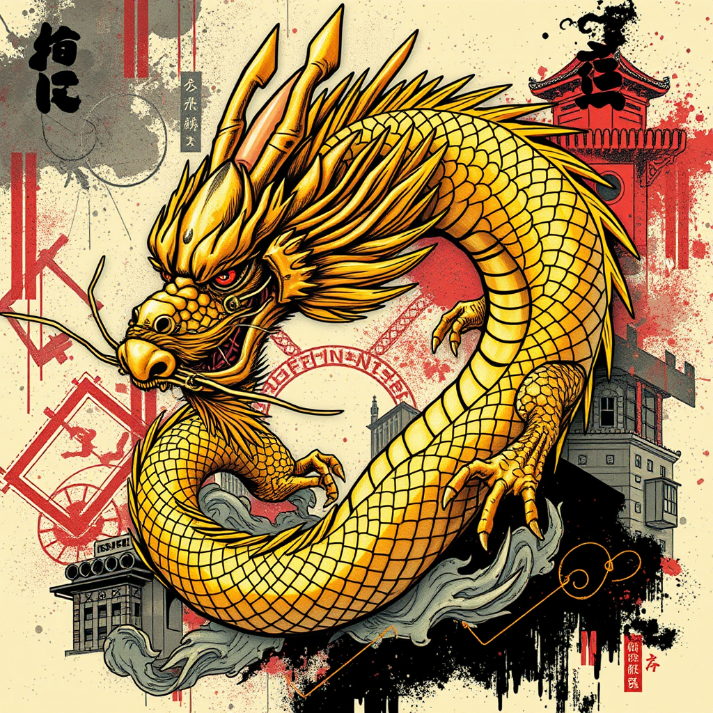 3/4 view fantastical Chinese-style dragon, infused with inkpunk aesthetics, featuring a shimmering metallic gold leaf head. The design echoes the vibrant and edgy style of Gorillaz, blended with the energetic flair of FLCL, and the intricate, bold lines reminiscent of Yoji Shinkawa's work. The dragon's form twists dynamically, its scales glistening with a surreal metallic sheen, as it weaves through a backdrop infused with urban and futuristic elements, capturing the essence of both tradition and modernity.