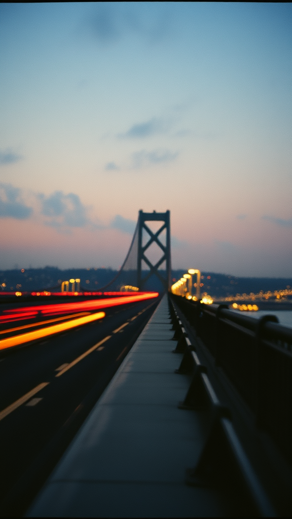 35mm film photo from a bridge, soft motion trails of city lights, twilight tones, textured, evocative and cinematic atmosphere.