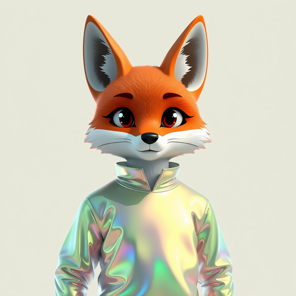3D cartoon fox head with a human body, adorned in a shimmering iridescent holographic liquid texture shirt paired with a translucent material sun protective top, exuding an air of confidence and authority. The attire, inspired by Nike or Adidas, reflects a sun-protective functionality with a WitchPunk and Y2K twist, featuring hues of green and blue. The design boasts a metallic feel with strong reflections, set against a pure, single-color background. This digital fashion piece embodies surreal futurism, merging elements of Disney style and Supreme Kong NFT artwork aesthetics. It echoes the essence of HAPE PRIME NFT, Bored Ape Yacht Club NFT project, showcasing an ultra-high 8K resolution with exquisite detailing. The front lighting accentuates the fox head's fine luster in a fashion editorial aesthetic, tailored for headshot photography in a portrait studio setting. The result is a blend of high detail and formidable style, embodying the cutting edge of digital fashion with a captivating 3D render and OC render quality.
