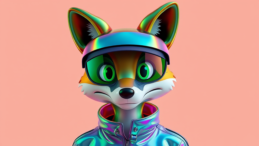 3D cartoon fox head with an anthropomorphic body, clad in a futuristic iridescent holographic outfit featuring liquid-like texture and translucent material. The attire, exuding a boss-like aura, incorporates Nike or Adidas sun-protective elements, blending witchpunk and Y2K aesthetics in a vibrant palette of greens and blues with a striking metallic sheen. The design is reminiscent of surreal futurism and digital fashion, akin to Supreme Kong NFT and Bored Ape Yacht Club styles, characterized by high detail and reflection. Set against a pure, single-color background, this high-resolution, 8K render is illuminated with bright frontal lighting, capturing the essence of a fashion editorial shoot in a Disney-inspired, ultra-detailed headshot format.