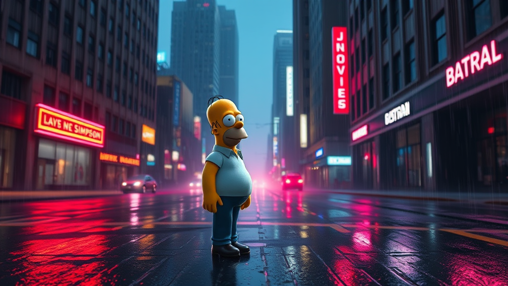 3D cartoon Homer Simpson standing in a desolate rain-drenched dystopian city, illuminated by distant neon lights reflecting off the wet pavement. The street is deserted and shrouded in shadow, with towering buildings adding to the bleak atmosphere. Cinematic moody tones reminiscent of a futuristic noir film, with elements borrowed from a hyper-realistic Blade Runner universe, captured in ultra-clear 4k detail. Holistic and striking, hinting at both the melancholy and surreal within the chaos.