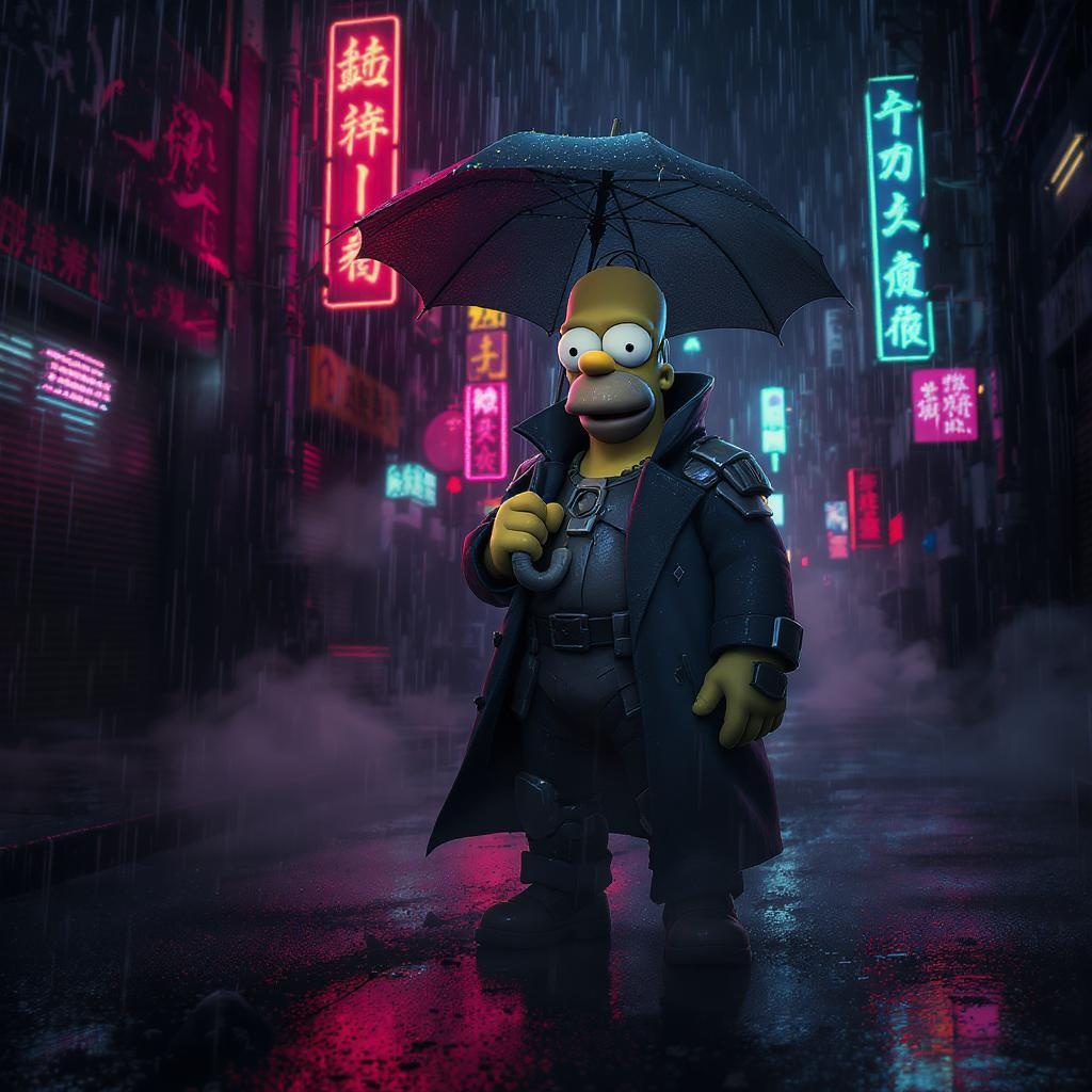 3D cartoon Homer Simpson standing in a dim, rain-soaked dystopian city street, with a desolate atmosphere. Neon lights flicker in the background, casting vibrant reflections on wet surfaces. The scene is cinematic and moody, reminiscent of a Blade Runner aesthetic. Ultra-high definition, hyper-realistic details, with Homer wearing a futuristic trench coat and holding an umbrella. Mist swirls around his feet, adding to the mysterious ambiance.