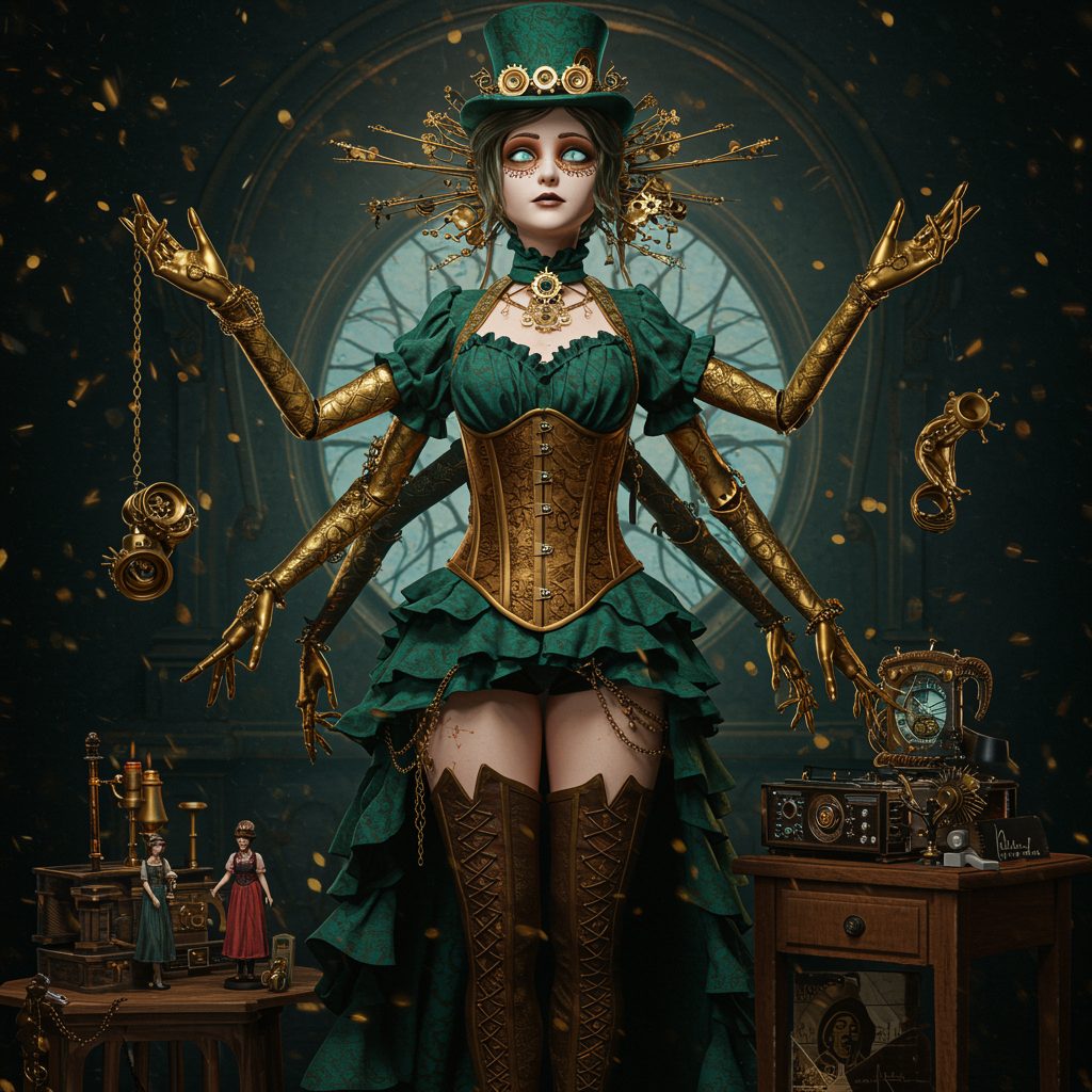 3D image of a steampunk woman inspired by Bella Kotak, characterized by gold and cyan hues, with photorealistic detail and a dark fairy tale vibe. The scene includes intricate miniatures and a style reminiscent of Artgerm. Despite the photorealism, the artwork embraces elements like extra limbs and fingers, unusual body positioning, and mismatched eyes, creating a surreal and imaginative appearance. Composition focuses on the uncanny and imperfect, capturing beauty in distortion and mutation with a dreamlike atmosphere that challenges traditional depictions.