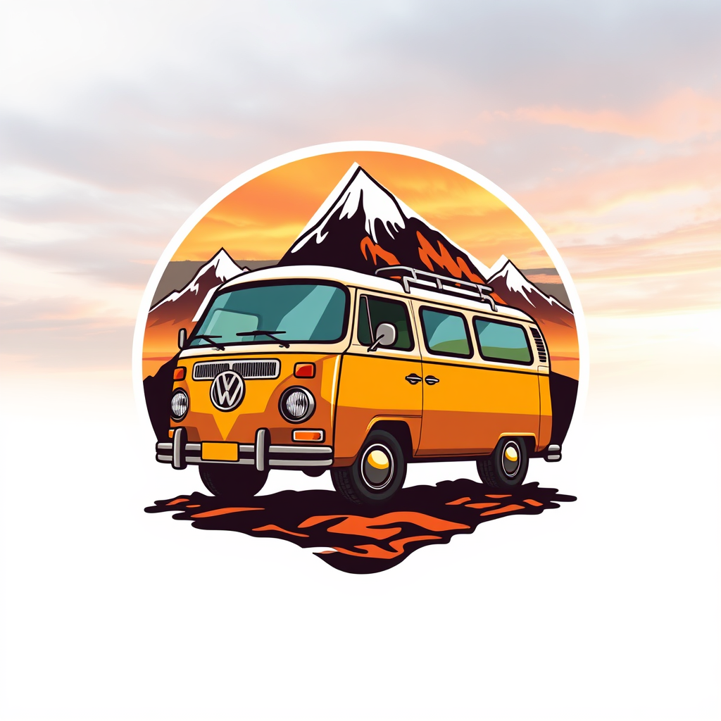 3D logo icon featuring a realistic, high-detail kombi van set against a breathtaking landscape, symbolizing adventure and wanderlust. The graphic design incorporates rich, vibrant RAW colors, highlighting every intricate feature of the van and the surrounding environment. The scene is captured in stunning 8K resolution, with creative modifications that enhance the essence of exploration, freedom, and the spirit of the open road.