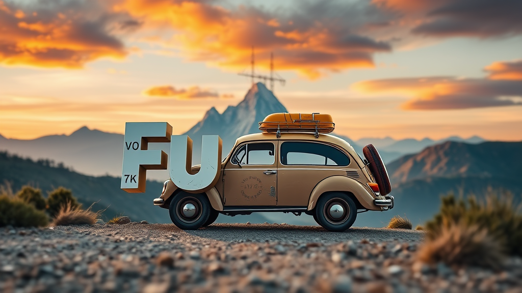 3d logo icon of a classic fusca adventure scene captured in high detail with realistic graphic design elements, showcasing vibrant RAW colors in a breathtaking 8k landscape backdrop, with subtle creative twists that enhance the sense of exploration and excitement.
