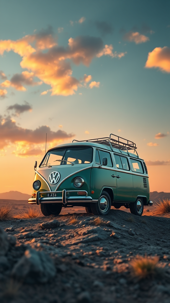 3D logo icon of a detailed, realistic kombi set against a landscape, embodying the spirit of adventure. The artwork features high-detail, raw color artistry, with a focus on capturing the vibrancy and essence of exploration. The scene is depicted in 8k resolution, enhancing the intricate design elements and vivid colors, while allowing for subtle creative touches like unique lighting effects and dynamic composition to complement the adventurous theme.