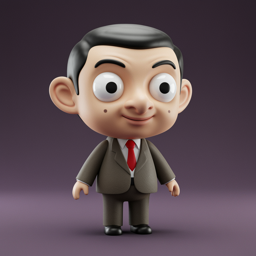 3D model in Nendoroid style, inspired by Japanese mascots and art toys; a secret collectible figurine showcasing a beautifully rendered product picture. Imagine a Mr. Bean character striking relaxed poses with design influences from Studio Ghibli, capturing a shiny and whimsical mood.