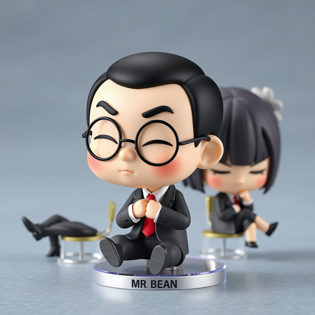 3D model, Nendoroid-inspired, Japanese mascot, secret collectible art toy figurine, beautiful 3D render, product image, Mr. Bean character in relaxed poses, designed by Studio Ghibli, shiny and enchanting mood.