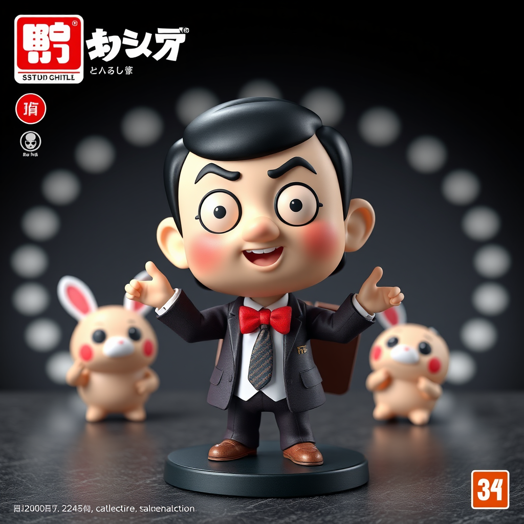 3D model, Nendoroid-inspired style, whimsical Japanese mascot, collectible art toy figurine, stunning 3D render, exclusive limited edition product, Mr. Bean character, witty playful poses, design influenced by Studio Ghibli charm, mood lustrous and captivating atmosphere.