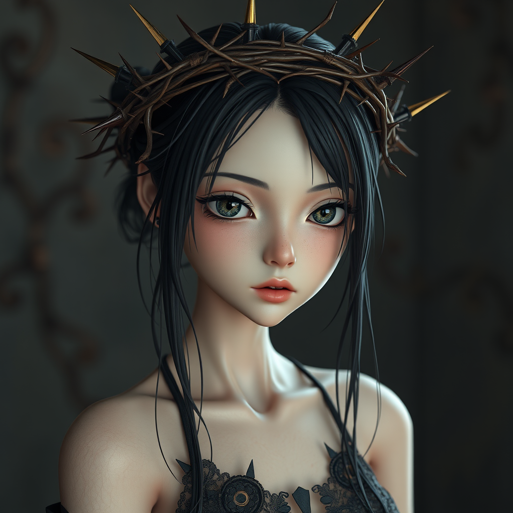 3d model of a captivating, slender girl adorned with an intricate crown of thorns and additional spikes, rendered in a hyper-detailed, realistic style, blending anime-inspired character design with exquisite portraiture. The scene embodies heistcore and dragoncore aesthetics, showcasing realistic figures enveloped in an aura of delicate realism, highlighted by a palette of dark, moody colors, with creative elements adding depth and mystique.