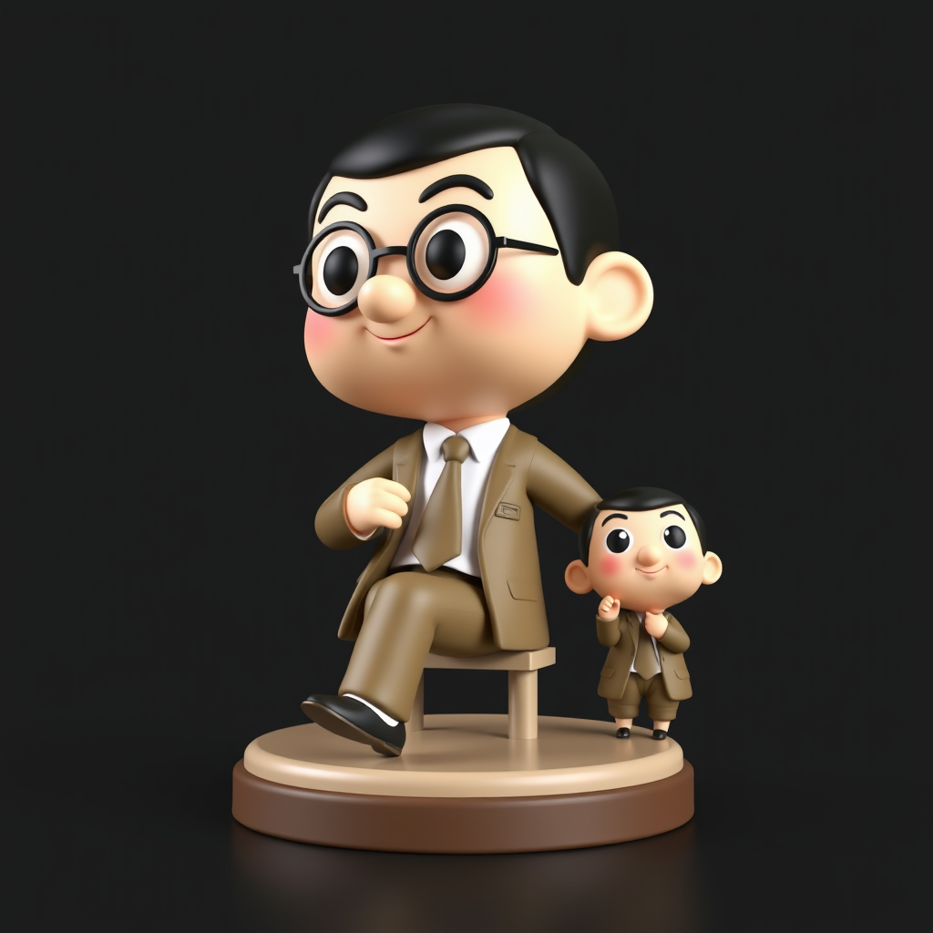 3D model of a Nendoroid-style Japanese mascot figurine, inspired by art toys and secret collectibles, featuring a whimsical Mr. Bean character in a series of relaxed poses. Designed with a touch of Studio Ghibli magic, the figure boasts a beautifully shiny finish, captured in a stunning 3D render to emphasize its unique charm.