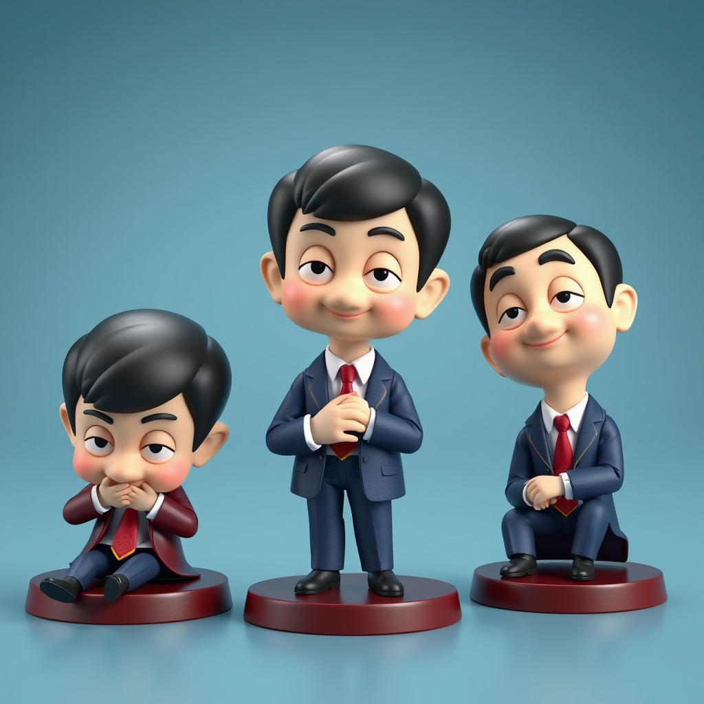 3D model of a Nendoroid-style Japanese mascot, inspired by secret collectible art toys, featuring a beautifully rendered Mr. Bean character in relaxed poses, designed with Studio Ghibli's touch, exuding a shiny, vibrant mood, ideal for product showcases.