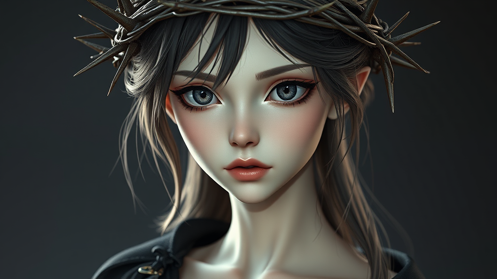 3d model of a striking slender girl adorned with an intricate crown of thorns intertwined with additional spikes, styled in realistic and hyper-detailed renderings that blend anime-inspired character features with realistic portraiture. The theme incorporates elements of heistcore and dragoncore, highlighting realistic figures with delicate realism. The scene is enhanced with a palette of dark and moody colors, creating an atmosphere of enigmatic allure and sophistication.