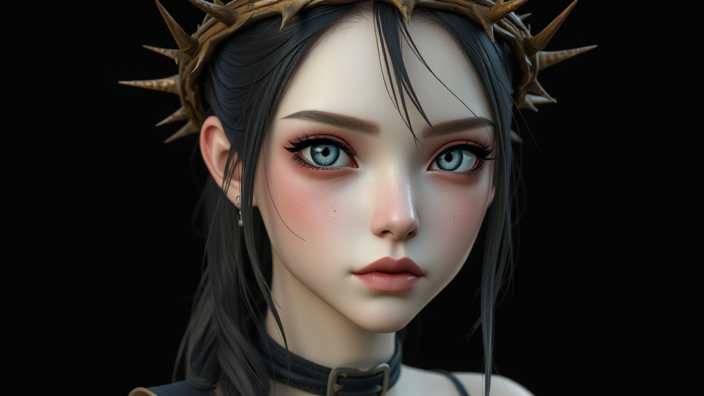 3D model of a stunning, slender girl adorned with a crown of thorns, accented with extra spikes; designed in a style combining realistic and hyper-detailed renderings with anime-inspired aesthetics. Capturing a sense of adventure with elements of heistcore and dragoncore, she presents a realistic portrait with lifelike features. Delicate realism emerges from the dark color palette, creating an intriguing and mysterious allure.