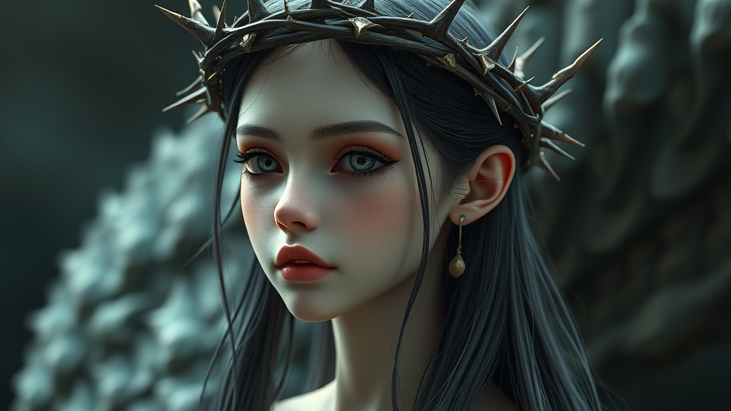 3D model of a stunning, slender girl wearing a crown of thorns with additional spikes, blending the aesthetic of anime-inspired characters with hyper-detailed realistic renderings. Her features embody delicate realism with an intriguing heistcore and dragoncore style. The composition highlights realistic portraiture and figures, enveloped in a palette of dark, mysterious colors, capturing an air of enchantment and danger.