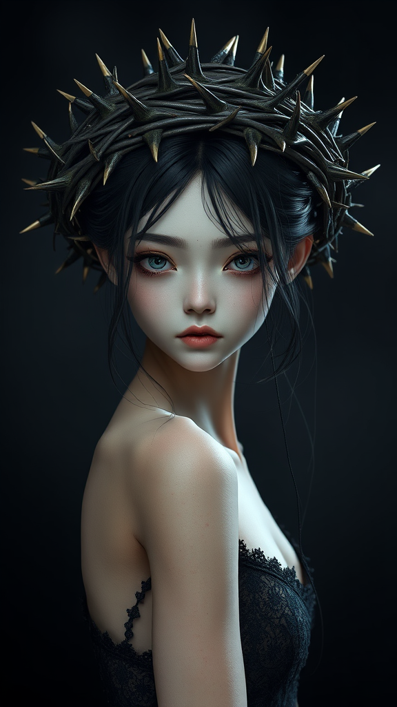 3d model of a stunningly slender girl adorned with an elaborate crown of thorns, enhanced with additional spikes, blending realistic and hyper-detailed renderings with anime-inspired aesthetics, capturing a lifelike portraiture. She embodies the essence of heistcore and dragoncore, her presence striking a balance between realistic human figures and delicate realism. The use of dark, moody colors enriches the scene, highlighting her enigmatic allure while subtle details evoke a sense of mystique and strength.