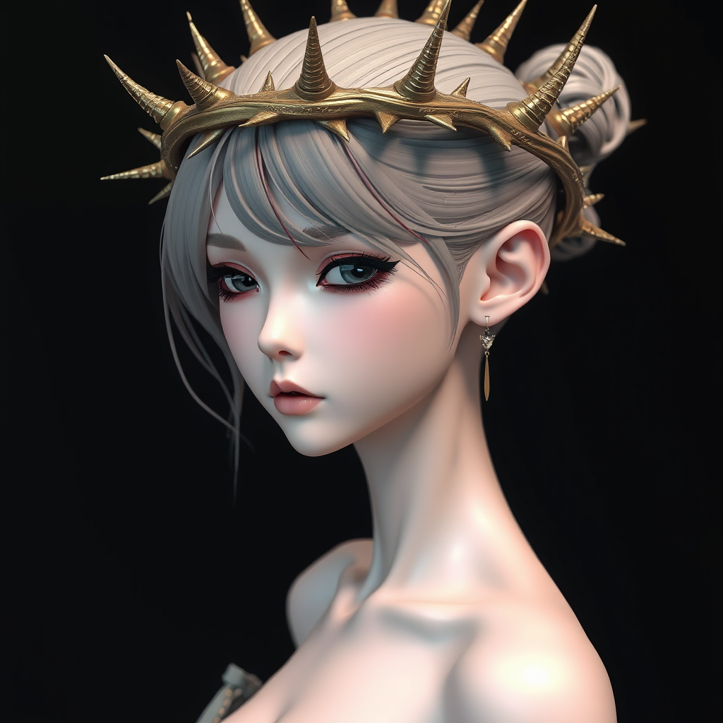 3D model of a stunningly slender girl adorned with a crown of sharp thorns, embellished with additional spikes, crafted in the style of hyper-detailed and realistic renderings. She embodies anime-inspired elegance and realistic portraiture, infused with elements of heistcore and dragoncore. The figure captures delicate realism, with an emphasis on dark, moody colors that highlight her ethereal beauty and mysterious allure.