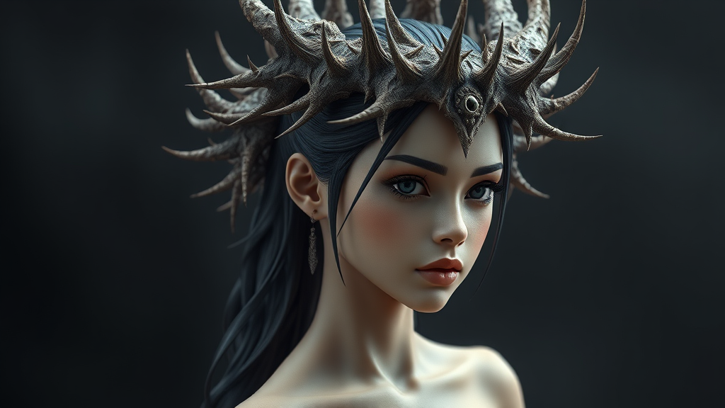 3D model of a stunningly slender young woman adorned with an intricate crown of thorny spikes, reminiscent of a fusion between anime-inspired character design and hyper-realistic portraiture. The portrayal captures delicate realism through dark and moody colors, evoking an aesthetic that blends heistcore and dragoncore elements. Her figure is rendered with meticulous attention to detail, showcasing a harmonious balance between realism and fantasy, evoking a sense of mythical intrigue.