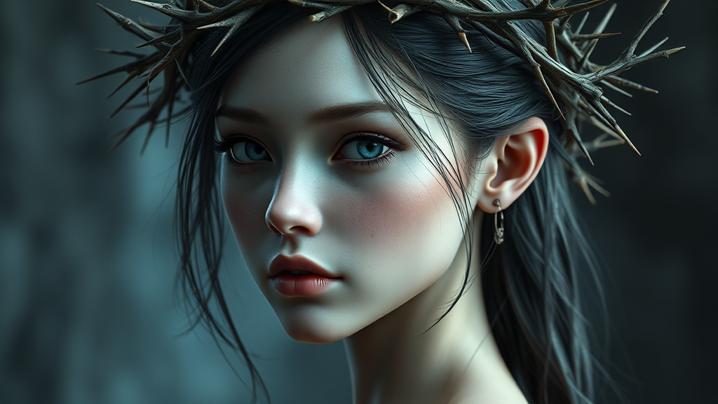3D model of a stunningly slender young woman adorned with an intricate crown of thorns, featuring additional spikes, rendered in hyper-realistic detail with a touch of anime inspiration. The scene blends elements of heistcore and dragoncore, presenting her as a captivating, enigmatic figure. Her delicate, lifelike features are portrayed with a mastery of realism, enveloped in a palette of dark, moody colors that enhance her mystical allure.