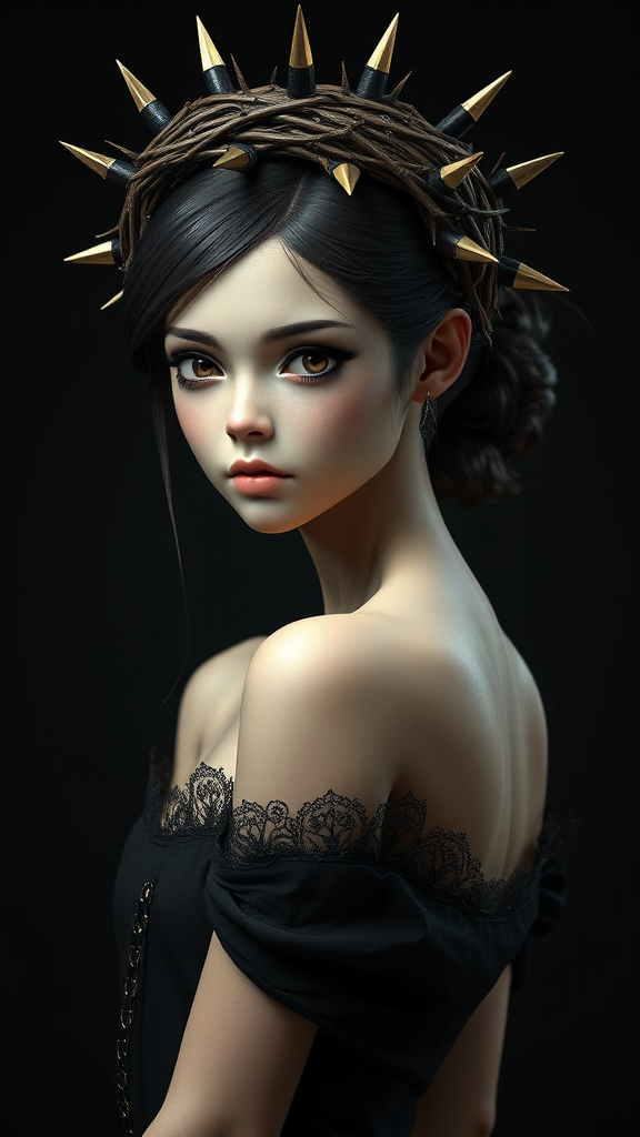 3D model of an elegant, slender girl adorned with an intricate crown of thorns accented with additional spikes, a fusion of realistic, hyper-detailed renderings and anime-inspired character design. Her presence exudes a sense of enigmatic allure, embodying elements of heistcore and dragoncore aesthetics. The portrait captures the delicate realism of her features through a palette of dark, muted colors, creating a harmonious blend of realistic figures and fantastical elements. The overall composition presents a striking contrast, highlighting her ethereal beauty amidst the mysterious and shadowy ambiance.