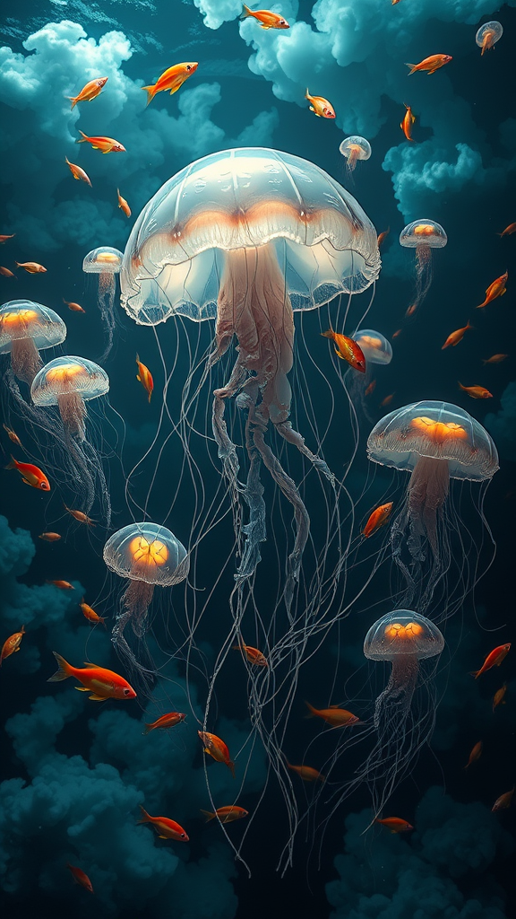 3D painting of ethereal jellyfish surrounded by vibrant fish and swirling clouds, with an atmosphere both dark and chaotic, blending hues of light black and shimmering aquamarine. The scene feels animated, as if it were an endless loop of an animated gif, layered with site-specific details. Gossamer fabrics float and weave through the environment, creating a fluid and gestural composition reminiscent of a dynamic Flickr gallery. The elongated aspect ratio, ar 35:52, enhances the dreamlike quality of this intricate underwater world.