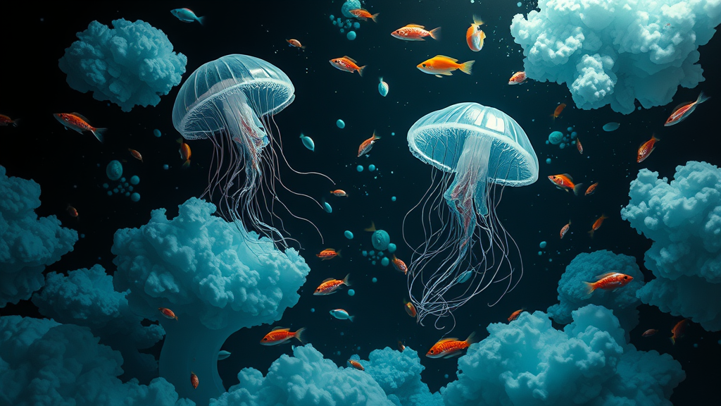 3D painting of ethereal jellyfish surrounded by vibrant fish and surreal floating clouds, in a dark and chaotic style with hues of light black and soft aquamarine. The scene imbues an animated gif-like movement, with site-specific art influences. Incorporates gossamer fabric textures, reminiscent of flickr's fluid and gestural imagery, creating a dynamic interplay in an aspect ratio of 35:52.