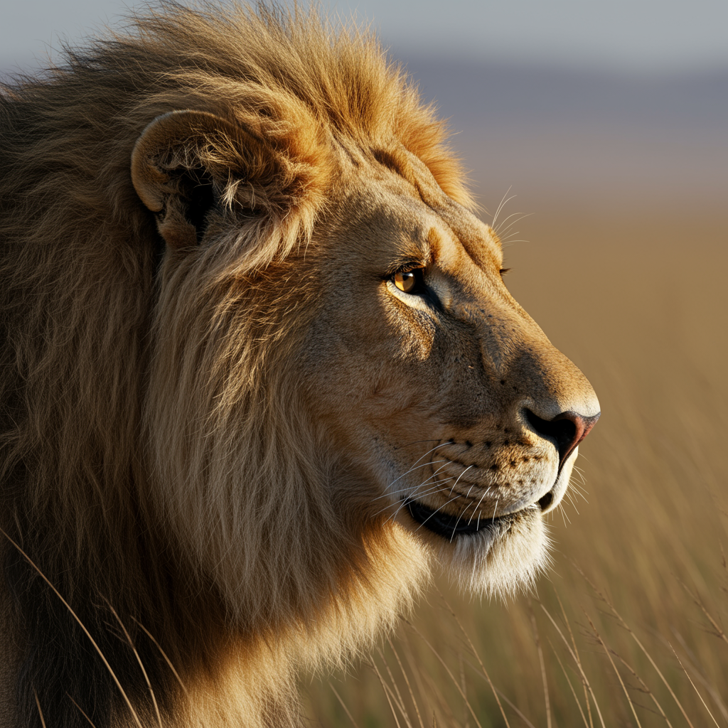 3d photorealistic capture, side profile of a majestic lion in the vast Serengeti, intimate close-up, echoing the style of Frans Lanting, taken with a Canon EOS R3 paired with an 85mm prime lens, encompassing the entire frame, ultra high-definition, aspect ratio 1:2, elevated aesthetic with a subtle artistic flourish.