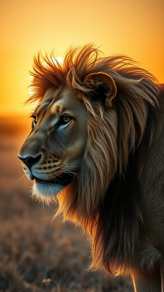 3d photorealistic image capturing a majestic lion on the plains of the Serengeti, side profile, extreme close-up, inspired by the evocative style of Frans Lanting; shot using a Canon EOS R3 with a 70-200mm lens, filling the entire frame in stunning high-resolution; the composition showcases the intricate details of the lion's mane and piercing eyes, set against the soft, golden hues of a setting sun, adding warmth and depth to the scene; aspect ratio 1:2, vivid stylization at 750 enhancing the majestic presence of the lion in its natural habitat.