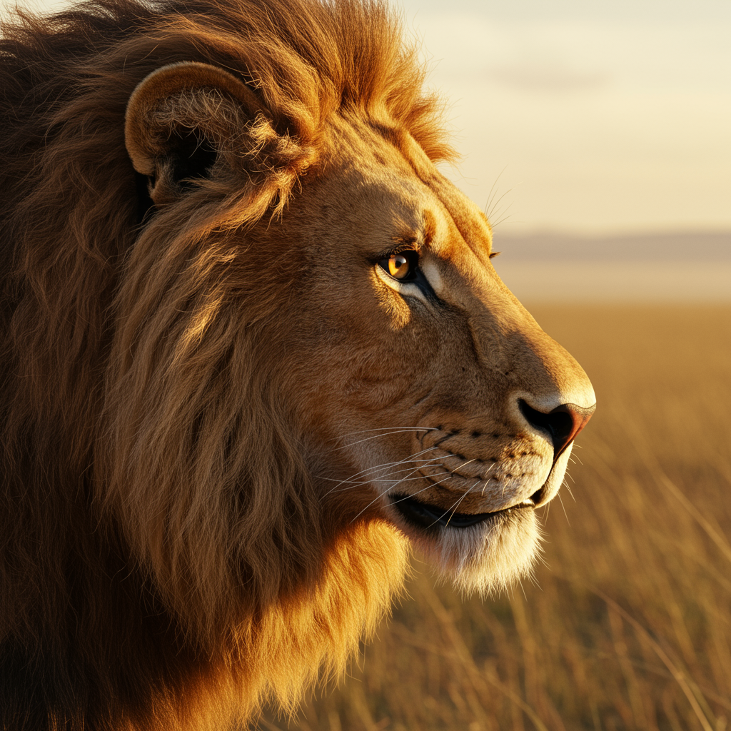 3d photorealistic image of a lion's side profile in the vast Serengeti, extreme close-up, mirroring the style of Frans Lanting, captured on a Canon EOS R3 with a high-quality 85mm lens, lion's mane gently ruffled by the wind, eye keenly focused on the horizon, filling the entire frame, high-resolution details showcasing each hair, golden light casting a soft glow, wide aspect ratio emphasizing the expanse of the landscape, stylized with organic textures.