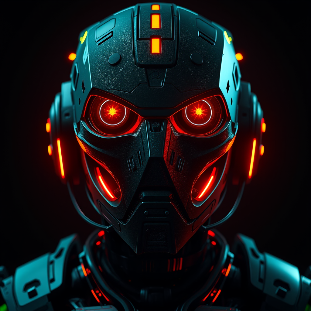 3D portrait of a futuristic robot, showing upper-body in front view, with a captivating neon glow featuring deep hues of orange and green, the robot's gaze fixed with glistening eyes. Set against a pitch-black backdrop, dramatic low-key lighting enhances deep contrasts, emphasizing the intricate textures and complex details. Utilizing RTX shader in Unreal Engine 5 for hyper-realistic rendering, the scene is detailed and chaotic, maintaining a raw style with a vertical aspect ratio for added intensity.
