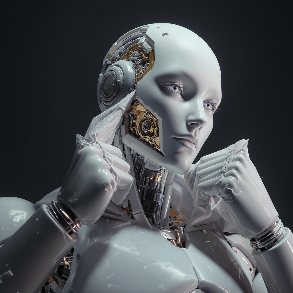3d render, exceptional quality, hyper-realistic, exquisitely detailed, dynamic low angle, half-body shot: captivating charismatic humanoid robot, complex impressive mechanism unveiling face, porcelain matte finish, gentle colors, emotive eyes, intricate and minute detailing, lifelike natural textures, elevated reflections