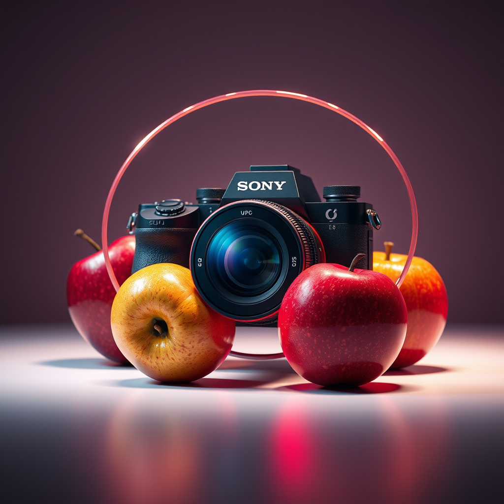 3D render of a conceptual still life featuring a Sony digital camera with vibrant, chromatic apples seemingly in orbit around it. The composition is captured in sharp, dramatic lighting, emphasizing fine details through hyper-realistic textures. Rendered using Unreal Engine and Octane Render, the digital art piece is designed to trend on Artstation, showcasing an 8k resolution. The scene is intricate and mesmerizing, blending concept art with photorealism, set against a vertical aspect ratio of 1:2, with a focus on modern elegance and innovation.
