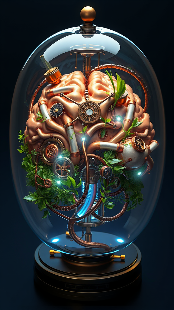3D render of a futuristic baroque concept design featuring an anatomically correct brain apparatus encased within a glass terrarium; elements of steampunk aesthetics interwoven with intricate scientific details; hyper-realistic intricacy showcasing a network of copper and brass mechanisms intertwining with delicate greenery; glowing bioluminescent accents and fluid tubing; the transparent dome encases the brain revealing its complex synapses and neural pathways, embedded gears and cogs illustrate the fusion of organic and mechanical; photorealistic portrayal emphasizing texture and material contrast.