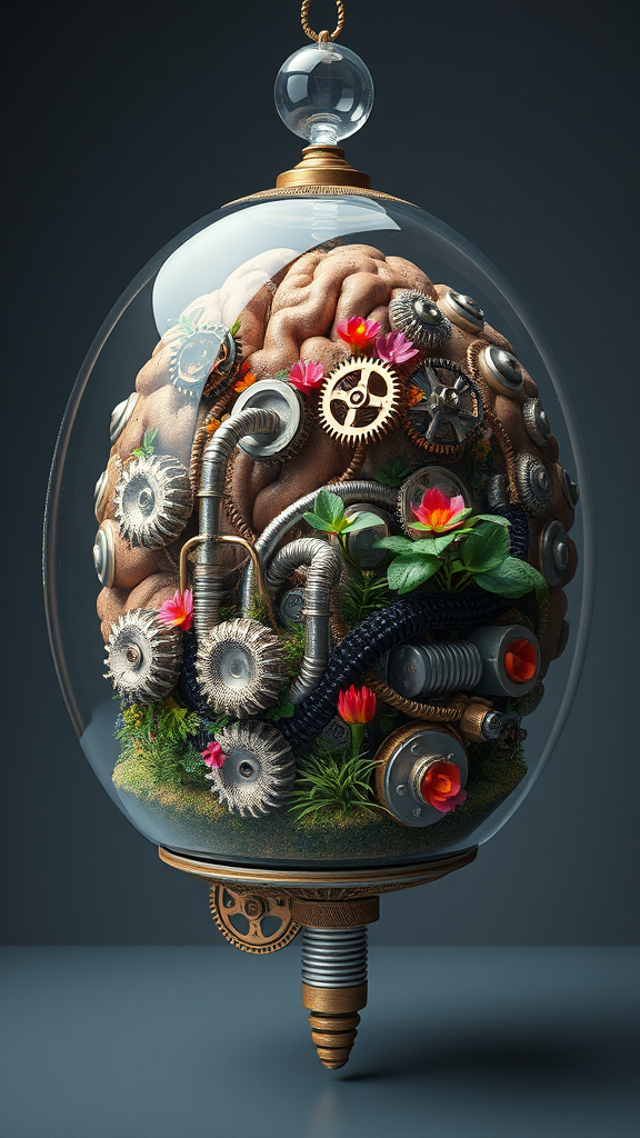 3D render of a futuristic baroque-inspired brain apparatus, featuring an anatomically accurate design encased in a glass terrarium. The device intricately combines steampunk aesthetics with a scientific twist, showcasing gears, tubes, and circuitry woven through the detailed neural structures. Vibrant flora and miniature ecosystems are embedded within the transparent casing, adding a lifelike element. Hyper-realistic textures and lighting highlight the complex patterns and metallic finishes, creating a mesmerizing blend of organic and mechanical.