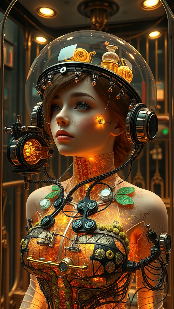 3D render of a highly detailed surreal airbrushed artwork depicting dopamine coursing through a sci-fi baroque design of an anatomically correct 18-year-old girl's full-body device. The piece features a terrarium with steampunk elements, intricate scientific details, and is hyper-detailed and photorealistic. The ambient lighting enhances the mood as it draws inspiration from artists like Ilya Kuvshinov, Artgerm, Alphonse Mucha, and Greg Rutkowski. The piece delivers a dreamy and atmospheric feel, blending the realms of technology and nature with a unique artistic touch.