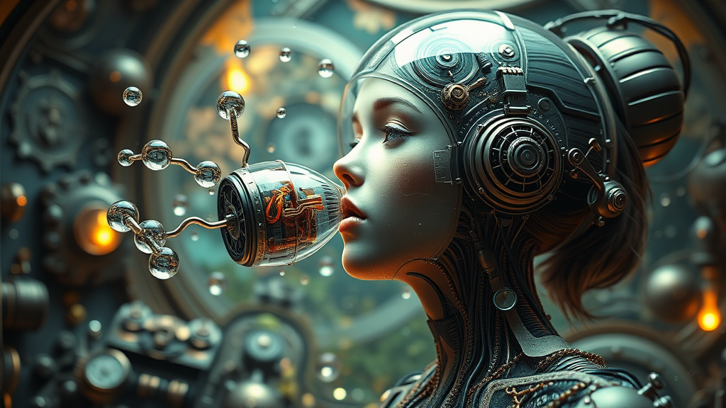 3D render of a highly detailed surreal airbrushed art depicting dopamine flowing through a sci-fi baroque concept of an anatomically accurate 18-year-old girl full body device with elements of a terrarium, steampunk influences, and intricate scientific details. The scene is hyper detailed and photorealistic, featuring ambient lighting. Art inspired by Ilya Kuvshinov, Artgerm, Alphonse Mucha, and Greg Rutkowski style, with an intentional low quality and blurry appearance.