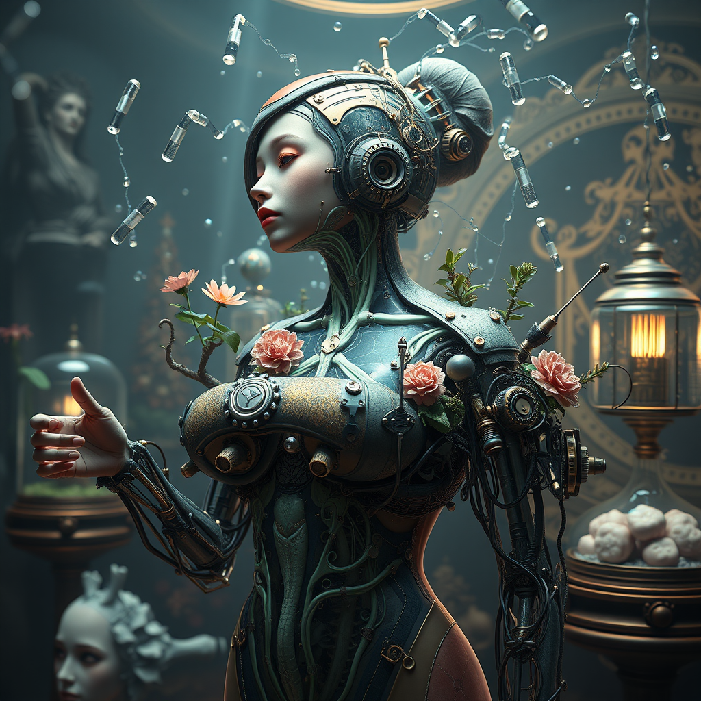 3D render of a highly detailed surreal airbrushed art of dopamine flowing through a sci-fi baroque-themed anatomically correct 18-year-old girl full body device with terrarium and steampunk elements, featuring intricate and scientific details with hyper-realistic and photorealistic qualities. Ambient lighting enhances the scene, inspired by the art styles of Ilya Kuvshinov, Artgerm, Alphonse Mucha, and Greg Rutkowski. The scene focuses on a fusion of organic and mechanical aesthetics, with the girl’s form seamlessly integrating with the terrarium’s ecosystem, capturing an ethereal blend of nature and technology.