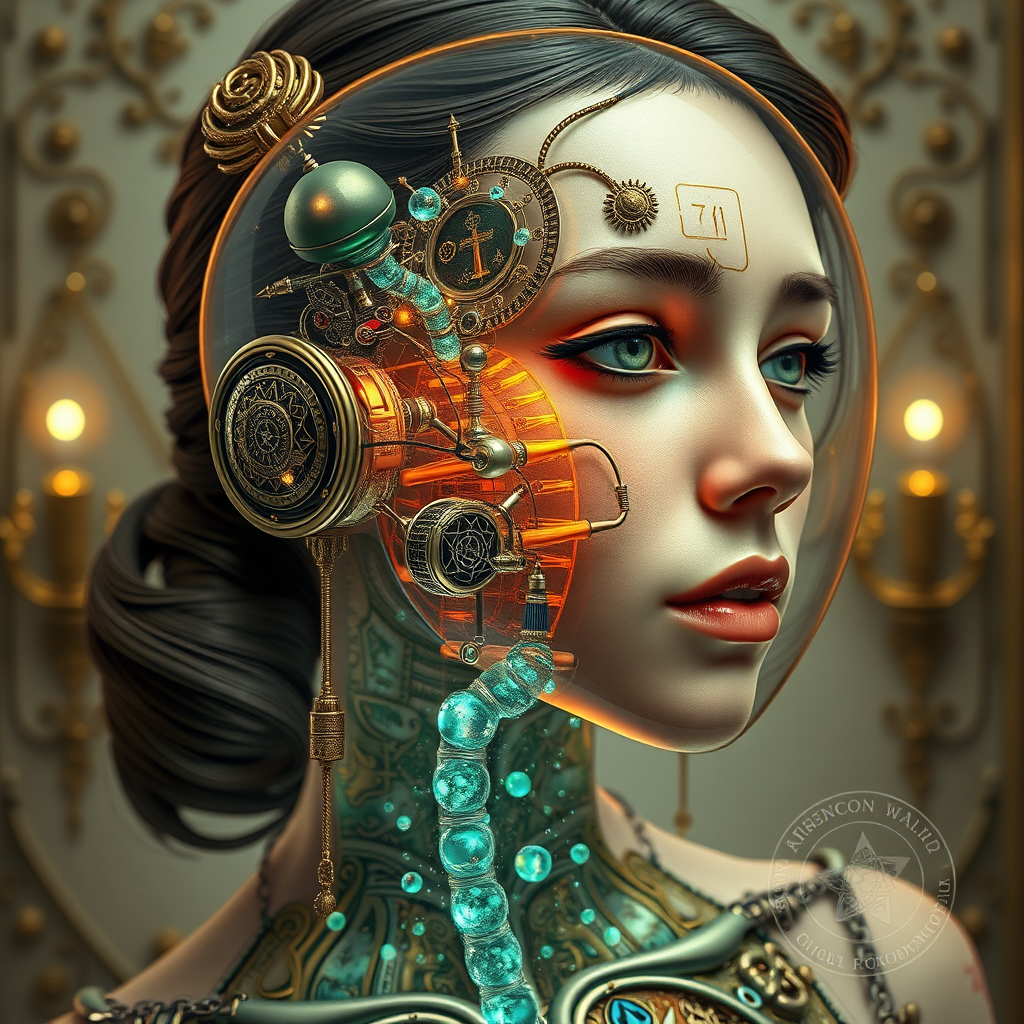 3D render of a highly detailed surreal airbrushed artwork depicting dopamine flowing through a sci-fi baroque-themed design of an anatomically correct 18-year-old girl. The concept incorporates elements of terrarium and steampunk with intricate scientific details, achieving a hyper-detailed and photorealistic finish. The ambient lighting enhances the art style inspired by Ilya Kuvshinov, Artgerm, Alphonse Mucha, and Greg Rutkowski. Despite the photorealism, the watermark suggests a fusion of low quality and slightly blurred aesthetics.