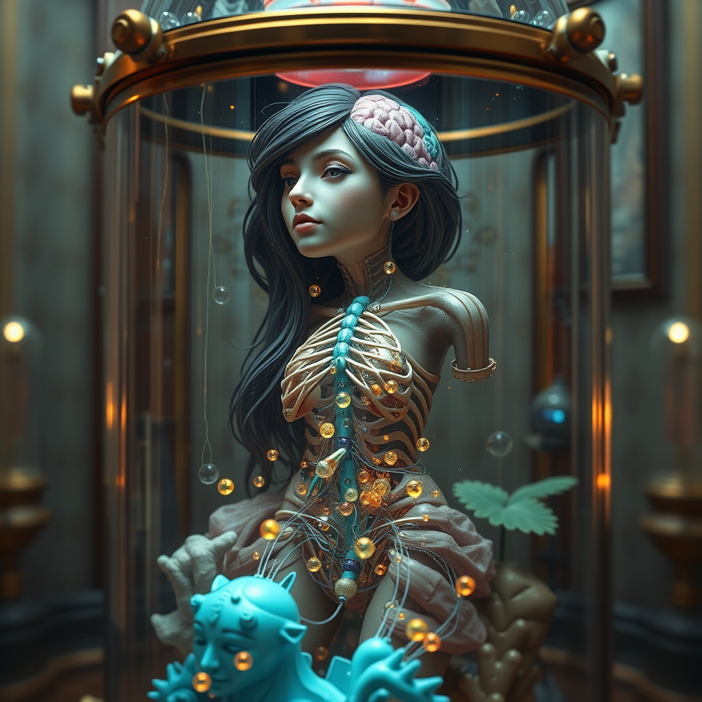 3D render of a highly detailed surreal art piece featuring dopamine flowing through a sci-fi baroque-inspired design of an anatomically accurate 18-year-old girl. The full body is encased in a steampunk terrarium-like device, showcasing intricate scientific details. Hyper-realistic and photorealistic features are enhanced by ambient lighting. The artwork takes inspiration from Ilya Kuvshinov, Artgerm, Alphonse Mucha, and Greg Rutkowski, blending their unique styles. The image is presented with a sense of mystery but is slightly low quality, adding a dreamlike, blurry effect.