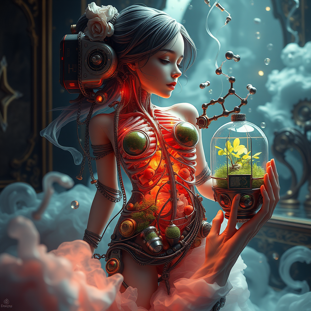 3D render of a meticulously detailed surreal airbrushed artwork featuring dopamine flowing through a sci-fi baroque concept design of an anatomically correct 18-year-old girl full body device. The design includes elements like a terrarium and steampunk influences, showcasing intricate details with scientific accuracy. The scene is hyper-detailed and photorealistic, utilizing ambient lighting. The artistic style draws inspiration from renowned artists such as Ilya Kuvshinov, Artgerm, Alphonse Mucha, and Greg Rutkowski. The artwork should convey a sense of mystery and sophistication, with a soft, dream-like atmosphere. Avoid the inclusion of any watermarks, and ensure the visual quality is clear and focused, capturing the essence of the surreal blending with the mechanical and organic elements seamlessly.