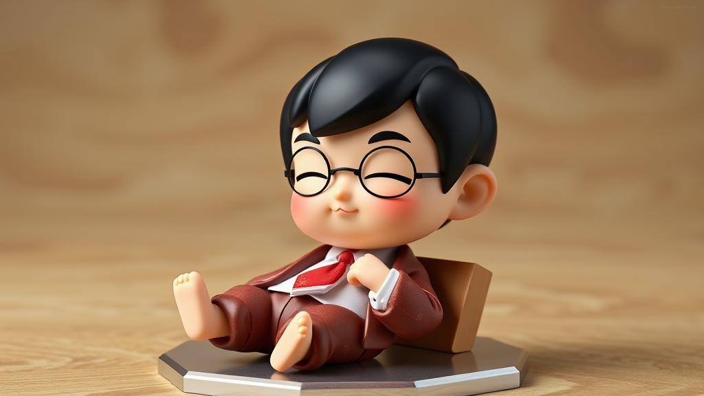 3D render of a Nendoroid-style collectible figurine featuring a Japanese mascot inspired by Mr. Bean, captured in a relaxed pose. The design is influenced by Studio Ghibli, with a shiny, glossy finish that highlights the character's whimsical charm. This art toy secret collectible showcases an intricately detailed, beautiful product picture, exuding a playful and endearing aura.