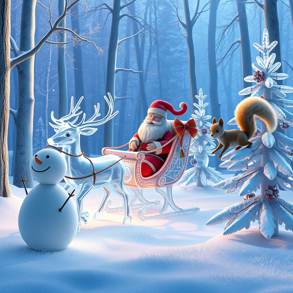 3D render of a photorealistic image in a Disney Pixar style. A magical frozen forest with crystalline trees, where detailed ice sculptures come to life. An enchanting ice Santa, intricately carved, sits in a shimmering sleigh drawn by majestic ice reindeer. Nearby, an amusing ice snowman stands with a cheerful expression. A curious ice squirrel perches on a glittering Christmas tree, its tail frozen in mid-flick. The sculptures exhibit complex designs and flawless forms, creating a stunning spectacle. Light dances across the snowy landscape, projecting playful shadows and adding a sense of movement. The scene is serene and idyllic, exuding a mystical, fairy-tale atmosphere, perfect for celebrating a holiday in a world of ice.