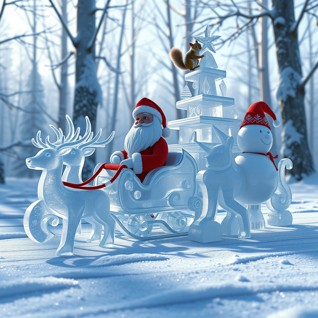 3D render of a photorealistic image in a Disney Pixar style. A snowy forest made entirely of glistening ice, featuring enchanting ice sculptures of Santa in an intricately detailed ice sleigh pulled by whimsical ice deer, accompanied by a playful ice snowman with a cheeky grin. A cheeky squirrel perches atop an ice-crafted Christmas tree. The ice figures are exquisitely detailed with flawless shapes, creating a mesmerizing visual spectacle. The scene captures dynamic movement, as light dances across the snow, casting lively shadows that playfully shift across the glistening ground. The atmosphere is serene and magical, evoking a sense of wonder and holiday charm in a world where everything is crafted from shimmering ice.